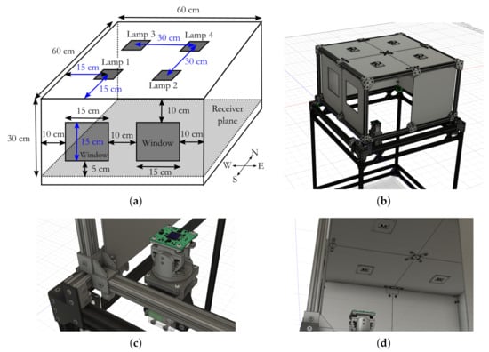 Figure 2 shows the design of a (length × width × height) mockup by using AutoDesk® Fusion 360. In this first version, the ceiling was equipped with four WLED lamps as it can be observed in the general scheme and the zoom of the ceiling of the mockup design. However, the ceiling can be easily modified to have different lamp arrangements. Configuring receiver location and orientation is enabled by using precise servo and stepping motor systems managed by an Arduino microcontroller. In addition, the interior of walls is painted with white plastic paint to emulate the effect of light reflection. Most of plastic pieces of this mockup were manufactured using 3D printers. Walls are fabricated with methacrylate by using laser cutter, which was also used to cut the metal bars to support the structure. Nylon filament was used to manufacture the pieces holding the LED electronic boards so as to dissipate heat during operation.