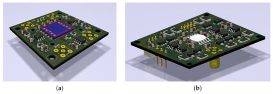 The optical receiver consists of a matrix of photodetectors (Hamamatsu S5107 P-i-N photodiodes) with a total active area of 100 mm connected to a transimpedance amplifier for each of the four channels. Emitters are based on standard commercial off-the-shelf (COTS) white LEDs which are fed by voltage-controlled current sources designed with operational amplifiers and power transistors. Figure 3 shows a 3D view of the electronic board designs of receiver and emitters by using KiCAD.