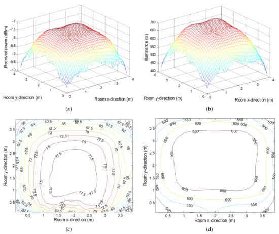 Received power and illuminance at receiver plane for room described in Table 1: (a) Power balance. (b) Illuminance. (c) Contour map of LOS component percentage in the total received power. (d) Contour map of illumination level.