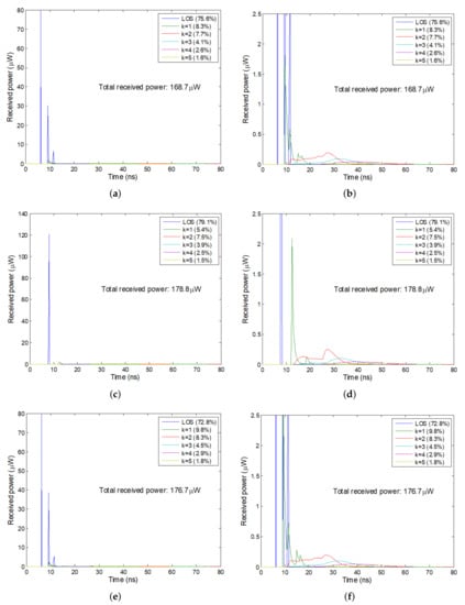 - Barry, J.R.; Kahn, J.M.; Krause, W.J.; Lee, E.A.; Messerschmitt, D.G. Simulation of multipath impulse response for wireless optical channels. IEEE J. Sel. Areas Commun. 1993, 11, 367–379. [Google Scholar] [CrossRef]