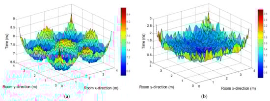 Simulated temporal dispersion of the impulse responses throughout the room: (a) Mean delay. (b) Delay spread.