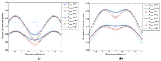 When several lamps collaborate to send information to a certain user, the orientation of the detector can be optimized to maximize the total received power. Figure 7 represents an illustrative case when there are two lamps serving a certain user and it moves along the x-direction. Four configurations of receiver orientation are considered: ‘max’ indicates that the receiver is oriented to find the maximum received power as possible (this is the more complex case as the receiver has to look for all the possible orientations trying to maximize received power); ‘near’ stands for the case when the receiver is pointing to its nearest lamp; ‘vert’ symbolizes vertical orientation upward and ‘comb’ is referred to an orientation that is the combination of receiver position with respect to each lth lamp weighted by the reciprocal of the square of its distance to the lamp, that is, the receiver orientation is: