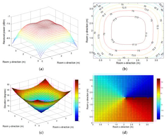 Received power throughout the room when the orientation method defined in Equation (14) is used: (a) Power balance. (b) Contour map of LOS component percentage in the total received power. (c) Elevation of the receiver as a function of its position. (d) Azimuth of the receiver as a function of its position.