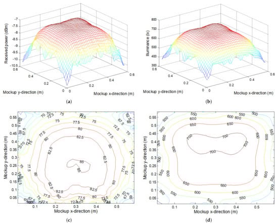Received power and illuminance at receiver plane for mockup illustrated in Figure 2: (a) Power balance. (b) Illuminance. (c) Contour map of LOS component percentage in the total received power. (d) Contour map of illumination level.
