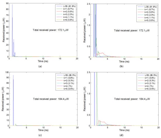 Figure 5 shows the simulated impulse responses at three locations for the receiver: under lamp 1 close to windows, at the center of the room and under lamp 4 near a corner without windows. As we can see, LOS component dominates the impulses responses although the percentage of contribution due to first and second order reflection of emitted light are significant. It can also be observed in Figure 5c,d how the reflection contribution is higher than that of for the receiver positioned at room center. This is because the light emitted from LEDs, which comes back to the ceiling after the first reflection on walls makes the ceiling (for ) a big emitting surface, this effect being more noticeable when receiver is located at central area of the room where first order reflection decreases due to the greater distance to the room walls. The delay spread D of the impulse’s responses throughout the room can be computed as [18]: