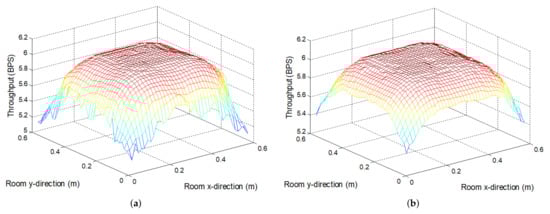 Simulated throughput in bits per symbol (BPS) at the receiver plane of the mockup by using the adaptive OFDM algorithm described in Section 3.2 (with ) for two situations: (a) Receiver pointing upward ( BPS, BPS, BPS). (b) Receiver oriented as defined by Equation (14) ( BPS, BPS, BPS).