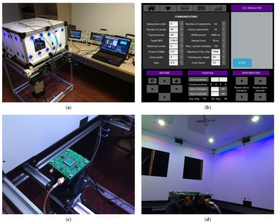 Views of the manufactured mockup: (a) General view of the experimental testbed. (b) Graphical user interface developed in Python. (c) Zoom of optical receiver. (d) Zoom of emitters at ceiling.