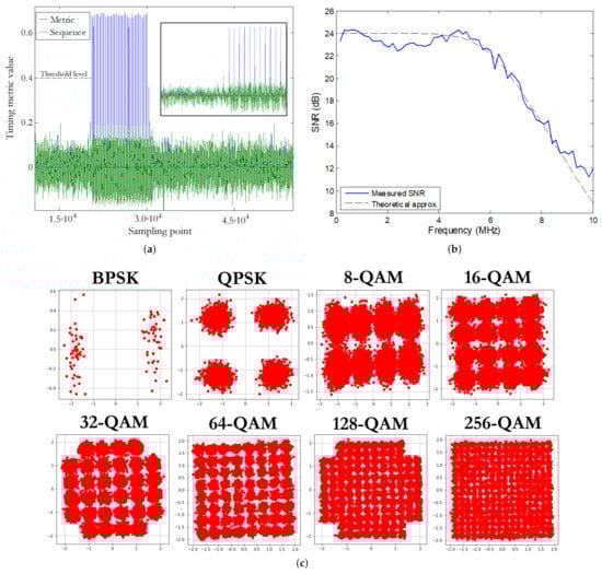 Figure 13a illustrates the timing metric during the evaluation of a received OFDM signal. The inset shows a transition between a random-data transmission and the start of a new training period. The narrow impulses shown in blue indicates the start of a new frame composed of training sequences and OFDM sequences conveying the random data, which will be used for synchronization at the receiver end. The Shapiro-Rudin training sequences can be easily identified in the figure due to its characteristic shape. All the other impulses following the first impulse will be ignored by the synchronizing module. However, during the transmission of random-data OFDM symbols there are no impulses with sufficient height that will cross the dedicated threshold level. This timing method allows the receiver to synchronize with the incoming signal so as to proceed to perform channel estimation and data demodulation. There is no need for another different channel to carry out synchronization between emitted signals and receiver, thus a real optical communication is emulated. Additionally, Figure 13b presents the average of the measured SNR as compared with a theoretical fourth-order low-pass response. Finally, Figure 13c depicts the symbol constellations obtained at receiver end for this transmission.