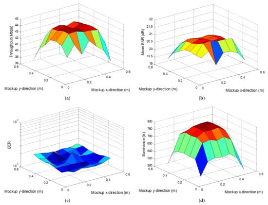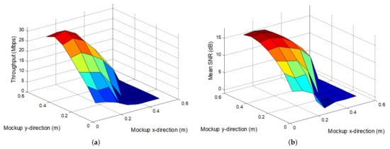 Figure 14 shows the experimental throughput and SNR measured when just one lamp is used to transmit data. In all the experiments, the receiver was located defining a matrix from an initial point cm, cm, with shift movements between neighboring positions of cm in x- or y-direction. In addition, when not specified, the receiver was oriented vertically pointing upward during the test. Moreover, this one-lamp experiment was performed without walls, thus direct LOS links were evaluated. We can observe how the system throughput and SNR are degraded rapidly when the receiver moves beyond 30 cm (the half of the mockup width) from the lamp location (this can be seen more easily in the throughput map of Figure 17a). Therefore, the coverage radius, where the data rate is above the half of its maximum, is approximately the half of the communication room width. We can also see how there is a zone in the opposite area of the room to the lamp position where the communication was no possible (insufficient SNR was obtained and null data rate was observed). This prompts the idea that independent VLC links without almost interference between them could be established at opposite areas of the room but no more than two of these links could operate simultaneously because interference when receiver only moves in either x- or y-direction from the lamp is evident as the communication, although seriously degraded, is still possible. Therefore, a coordinated cooperative scheme between lamp transmissions would be required [12].