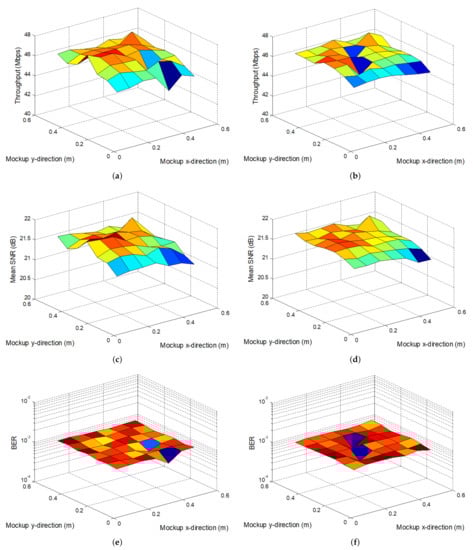 Experimental results for mockup with walls when the four lamps transmit the same data considering vertical orientation upward of the receiver and orientation given by Equation (14): (a) Measured throughput for vertical orientation ( Mbps, Mbps, Mbps). (b) Measured throughput for receiver orientation given by Equation (14) ( Mbps, Mbps, Mbps). (c) Measured mean SNR for vertical orientation ( dB, dB, dB). (d) Measured mean SNR for receiver orientation given by Equation (14) ( dB, dB, dB). (e) Measured BER for vertical orientation (, , ). (f) BER for receiver orientation given by Equation (14) (, , ).
