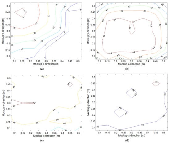 Once we know the power balance in the mockup, we can estimate the approximate data rate, which could be achieved throughout the receiver plane. Figure 11 shows the estimated throughput in bits per symbol (BPS) when adaptive OFDM is used as communication scheme (see Section 3.2). We have considered a fourth-order low-pass channel response with cut-off frequency at 65% of the communication bandwidth (which roughly fits typical VLC channel responses of experimental studies [24,25,32]) and a maximum SNR of 25 dB (at low frequencies) for the location at the center of the mockup receiver plane. Maximum SNR at other locations in the mockup are calculated based on the simulated received power at that location with respect to this reference level at the receiver plane center. For a target BER of , two situations are evaluated: receiver pointing upward and receiver oriented as defined by Equation (14) to maximize received power. We can see how, in the second case, a more uniform throughput with higher values at edge areas is observed but still vertical orientation constitutes a simple and effective solution as previously mentioned.