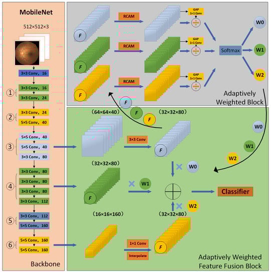 In this work, our purpose is to train a robust DR severity classification model with limited data, which is based on multi-scale feature fusion with adaptive weighting under MobileNetV3 architecture. As has been noted, different feature layers in the neural network model reflect different feature information of the image. The shallow feature map close to the input of the network has a high resolution and small local field of view, which can extract texture features of the image, such as the lines of the diseased image. The middle layer can learn the information that distinguishes image features through training. The high-level feature map of the network has a low resolution but a high field of view, which can effectively extract the semantic feature information of the image. The accuracy of the DR classification task depends on the effectiveness of feature extraction, and we believe that only the high level of the network may not be able to fully express the image features effectively. Our work makes full use of the feature information expressed by different layers and adopts adaptive weighting to fuse multi-layer features. In this way, the shallow features, intermediate features, and deep features are fused to further dig out image information. We hope that this method can extract rich texture information, and at the same time, it can obtain features with better robustness aim at various changes in the image and implement the advantages complementary of the features at different levels, thereby improving the accuracy of DR classification.