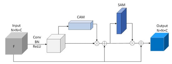 Residual Convolutional block Attention Module (RCAM), which connects channel attention module and spatial attention module are designed, and meanwhile, to prevent the gradient from disappearing, the residual module is added in this part. Figure 4 shows the structure of the RCAM module. In the RCAM structure, the original input F of the attention part undergoes a period of 3 × 3 convolutions (Conv), batch normalization (BN), and activation function (ReLU) operations, follows a Channel attention module (CAM) of size 1 × 1 × C and Spatial attention module (SAM) of size N × N × 1 and connects the residual twice. The CAM focuses on the meaningful part of each channel, can deduce information on tiny channels effectively; SAM, as a supplement to CAM, pays more attention to the location of valuable features.