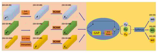 Figure 5 shows the structure of adaptively weighted feature fusion. At the left part of Figure 5, the low and high layers are resized to the same size as the middle layer. Then, the channel number of the high-level convolution block is changed through a convolution kernel with a size of 1 × 1 and the up-sampling is made through interpolation. To the low-level convolution block, the down-sampling through a convolution kernel with a size of 3 × 3 and a stride of 2 is performed directly. After these works, three feature maps of the same size were obtained through RCAM.
