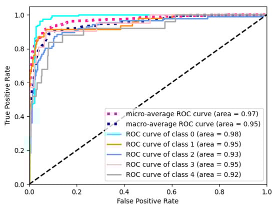 Furtherly, we give Figure 8 to depict the class-wise, micro-, and macro-AUC values for the proposed model. Although the ROC curve is usually applicable to binary classification, it can be extended to multi-classification problems in a one-to-many way. For example, the diabetic retinopathy classification task has five categories: 0, 1, 2, 3, and 4. When we need to generate a ROC curve of class 0, we can consider class 0 as the positive category, and the other four categories can be treated as a negative class. The ROC curve of every other class can be treated as a similar dichotomy problem. AUC is obtained by calculating the area under the ROC curve. The result achieves 0.97 micro-AUC and 0.95 macro-AUC.