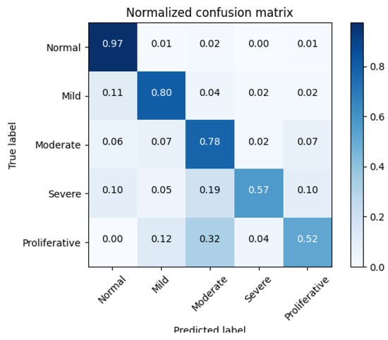 Figure 9 shows the confusion matrix when our model is applied to the DR severity prediction task. The horizontal axis represents the predicted value and the vertical axis represents the true label. One can see that, most of each category is predicted to the correct position, except for the Severe DR type (class-3) images and Proliferate DR type (class-4) images: a part of the Severe DR type images about 29% is incorrectly distinguished as the third and fifth categories, and a part of the Proliferate DR type images about 32% is classified as moderate. In general, the model presents excellent classification performance of DR detection, and the first category (No DR) is the easiest to detect, while the fifth category (Proliferate DR type) is the most difficult to classify.