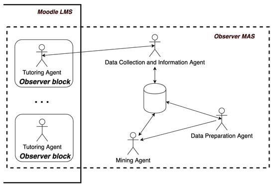 Software agents can be defined as programs that act on behalf of human beings, resolving inconsistencies, finding and integrating information from different sources, filtering out irrelevant or unwanted information, and adapting them to human needs [7]. Pedagogical agents are autonomous software entities that support the learning process through interaction with students, lecturers, and other participants and in collaboration with other similar agents [12]. The Observer system uses the following: tutoring agents; an agent who collects data, stores them in the system’s internal database, and informs tutoring agents about student suggestions from the system; a data preparation agent; and an agent who learns from the data and forwards the results (as shown in Figure 1).