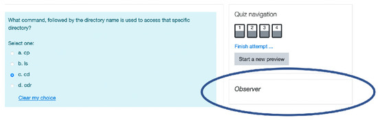 The Observer ITS tutoring agent is dedicated to monitor the student’s work, record his/her interaction with the teaching material, and inform students how the system values their efforts. For that purpose, the LMS Moodle elements named blocks are used to implement the agent. The blocks are graphical interface elements added to the left, right, or center column of the Moodle Page. Blocks are placed by the Moodle administrator or course creator on each specific page of teaching material where they deem it necessary or binds the presentation to the block setting’s context, allowing blocks to be placed on multiple pages at once. For an example of the Observer block placed on the LMS Moodle page, see Figure 2.