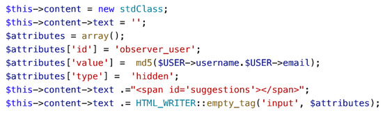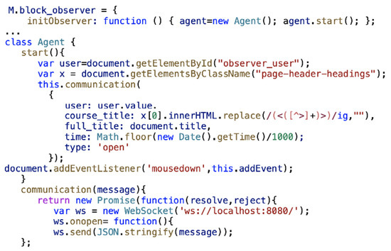 Block Observer performs three essential functions from the perspective of the system. The first function is to retrieve the username and email address from the Moodle database and generate hash values, using the MD5 algorithm to obtain the user (student) identification number. This number is linked to all subsequently collected data, which makes them anonymous. Figure 3 shows a section of the block’s PHP and JavaScript program code that provides an identification number and creates a hidden component of an HTML document whose value is student identification. Figure 4 contains the JavaScript code for the module.js file that creates and runs an agent.