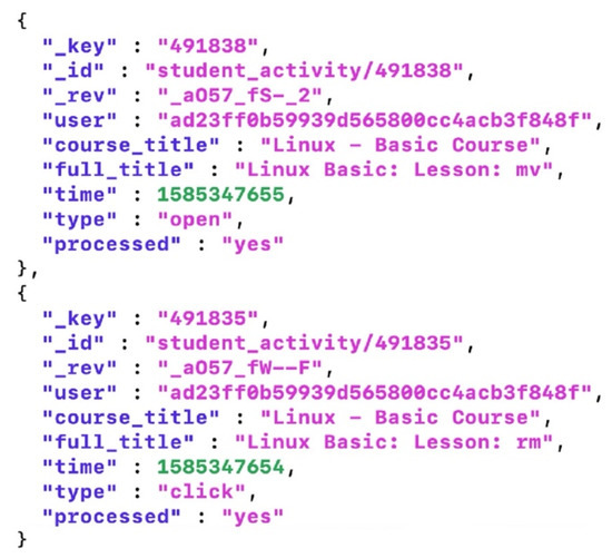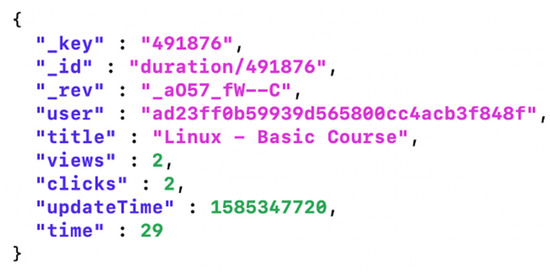 Agents use objects when storing the collected data in the database. Among the data obtained from the JSON object is time. The timestamp accuracy depends on the settings on the client device itself, which the data collection and information agent could unify by downloading time from the server. The purpose of the time information is not to determine when something happened but decide how long the student stays on a particular page; therefore, accuracy is not necessary.