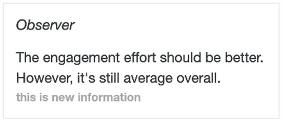 Student engagement refers to the degree of attention, interest, and commitment when learning or in class. Students committed to improving their skills and knowledge will undoubtedly be active within the virtual learning environment, such as Moodle, so engagement can be estimated using such systems logs [11]. The Observer system measures learning engagement in a virtual environment based on the number of clicks, time spent on the teaching material, and the number of reviews, all of which have proved to be an important indicator of success [2]. After measurement completion, the system provides suggestions to the student regarding his/her engagement by comparing it with their previous engagement and the engagement of other students.
