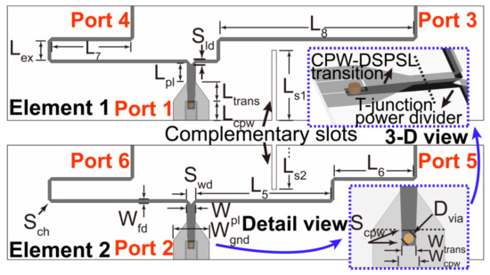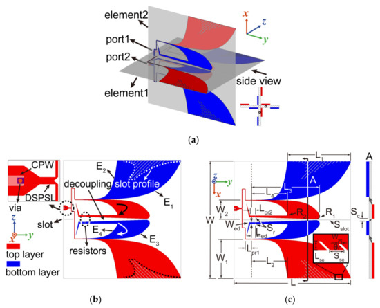 The configuration of the proposed dual-polarized double-slot ATSA (DP-DSATSA) is shown in Figure 1a. The DP-DSATSA is composed of two double-slot antenna elements, which are placed in a cross shape. It is clear that the two-sided metal with rotational symmetry about the Y-axis avoids the electrical contact of the two elements. The copper on the top layer is indicated in red while the copper on the bottom layer is blue. Port 1 and Port 2 are located on the opposite side of the radiating structure, feeding the double-slot structures of Element 1 and Element 2 by double-sided parallel strip lines (DSPSL). The details of the two double-slot antenna elements are shown in Figure 1b,c. The two elements have different feed lines and board cutting.