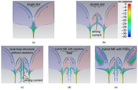 The surface current of ATSAs at 1 GHz and design evolution of radiating structure with the red part as the top metal layer, the blue part as the bottom metal layer, and the light gray part as the substrate. (a) The conventional ATSA; (b) the conventional DSATSA; (c) the dual-loop DSATSA without resistors; (d) the dual-loop DSATSA; (e) the dual-loop DSATSA with FSEs.