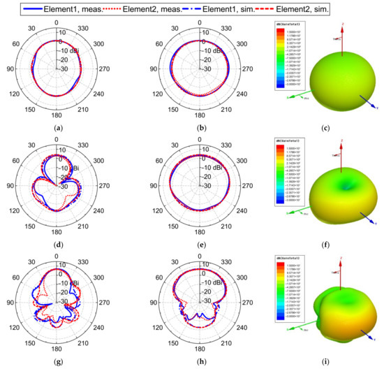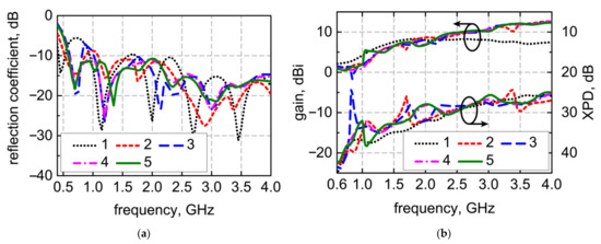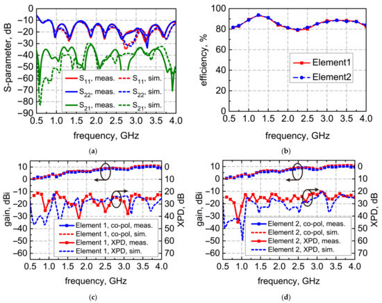 In Figure 8c,d, the simulated and the measured far-field characteristics for both elements are shown at different frequencies up to 4 GHz. The measured gain at boresight is between 1 and 11 dBi, which is almost the same as the simulated results. The measured XPD results in the direction of the boresight coincide well with the simulated ones. In the operating band, the XPD is higher than 20 dB. The small differences between the numerical results and measured results are mainly caused by manufacturing inaccuracies, including inaccuracies in the printed circuit board manufacturing and welding.