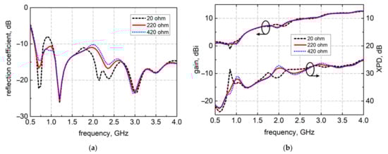 Performance comparison of Dual-loop DSATSA at different resistance values. (a) The reflection coefficient (S11); (b) the co-polarized gain and XPD at boresight.