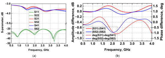 Figure 6a shows that the S11 of the input port is less than −20.5 dB from 0.5 to 4 GHz, while the insertion losses from the input ports to output ports are both less than 0.8 dB. The proposed feeding structure has excellent S-parameters among the ultra-wideband, ensuring a minimal insertion loss. To form a symmetric beam at the boresight direction, the amplitude imbalance and phase imbalance between the output ports are vital indexes in the design of the divider, affecting the boresight beam symmetry. The simulated results are presented in Figure 6b. The differences in amplitude and phase fluctuate around zero in the frequency domain, which are 0.3 dB and 1.5 deg, respectively. The dimensions of the radiation part and feeding structures are shown in Table 1. By integrating the radiation structure and balun-divider structure, two complete dual-loop loaded DSATSA elements can be obtained, as shown in Figure 1b,c. The dual-polarized antenna can be formed by integrating the two elements together.