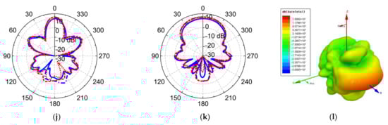 The simulated and measured gain patterns of the proposed elements in the DP-DSATSA. (a) E-plane patterns at 0.6 GHz; (b) H-plane patterns at 0.6 GHz; (c) 3D pattern at 0.6 GHz; (d) E-plane patterns at 1 GHz; (e) H-plane patterns at 1 GHz; (f) 3D pattern at 1 GHz; (g) E-plane patterns at 2 GHz; (h) H-plane patterns at 2 GHz; (i) 3D pattern at 2 GHz; (j) E-plane patterns at 4 GHz; (k) H-plane patterns at 4 GHz; (l) 3D pattern at 4 GHz.