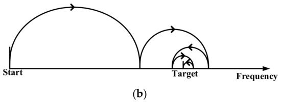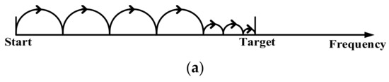 The locking method used by the NS-ADPLL is also different from TS-ADPLL. The specific locking process is shown in Figure 2. Figure 2a is the frequency change process of TS-ADPLL, which follows the target frequency step by step. Obviously, the locking time is related to the output frequency range, the bandwidth of the filter and the target frequency, etc. Figure 2b is the locking process of the NS-ADPLL. First, the relationship between and must be determined. If is smaller than , the minimum frequency () will be changed to , and then the increases. If is larger than , the maximum frequency () is changed to , and then decreases, which can be calculated as follows: