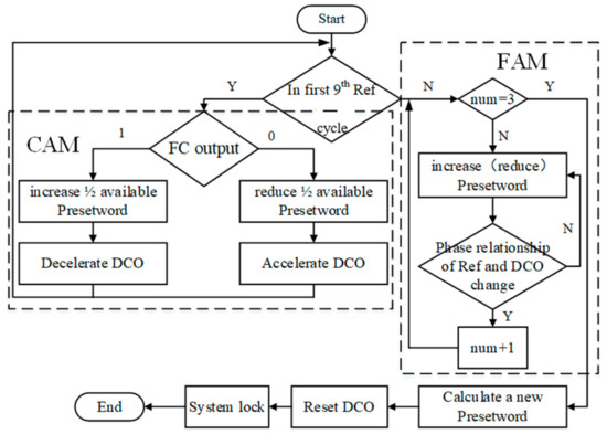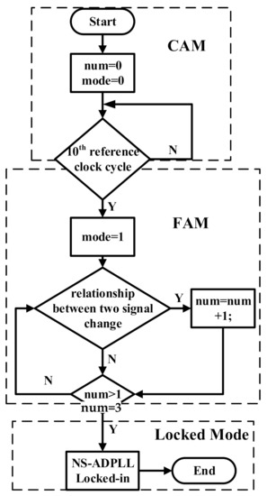 MA module is responsible for changing the NS-ADPLL working mode. NS-ADPLL has three working modes: CAM, FAM, and Locked-in mode. The working mode is changed according to the reference clock and the relationship between and . At the first 9 reference clock cycles, the NS-ADPLL works at CAM mode. In this working mode, the PW will be adjusted according to the Bisection Method. Because the is 40 MHz, the NS-ADPLL will stay in this mode for 225 ns. Then, the NS-ADPLL will change to FAM. In this mode, the PW will be changed slowly, and the system will enter the next mode after the relationship between and changes three times. The next mode is lock mode, where will continue to track , and the system is locked-in. The flowchart of MA module is shown in Figure 3.