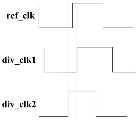 FC module is responsible for comparing the frequency between reference clock and reconstructed signal. It compares the frequency according to the phase. Figure 4 shows the FC module operating principle. Initially, the module will adjust the phase of , forcing the two signals have the same phase. Then, it senses the first positive edge of or . If reference signal comes first, it means that is larger than . If reconstructed signal comes first, it means that is larger than .