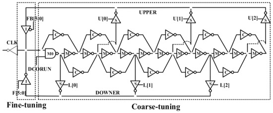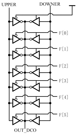 And the fine-tuning module is designed with the interpolator technique in order to improve the resolution of DCO. The schematic of the fine-tuning module is shown in Figure 8. It consists of two types of tri-state inverters; each type has seven inverters, and there are fourteen inverters in all. The first two tri-state inverters are connected to , so the fine-tuning module is controlled by a 6 bits binary control codes F[5:0]. When the control code is in low level, the corresponding tri-state inverter which is connected to the signal UPPER will open, and the one connected to the signal DOWNER will close conversely. The different number of the control code of tri-state inverter represent the different weighted size of tri-state inverter. The binary control code F[5:0] provides 64 options in fine-tuning stage. The total delay rang of the fine-tuning module is equal to one option of coarse-tuning module.