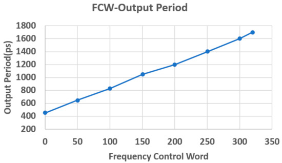 In order to prevent the dead zone, which may result in the NS-ADPLL unlocked, the control words and output frequency of DCO must be monotonic. Simulated output period time versus digital control-word for the DCO at 1.8 V supply voltage is shown in Figure 9. The output clock period increases with the control-word.