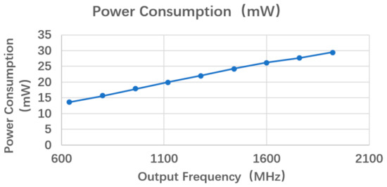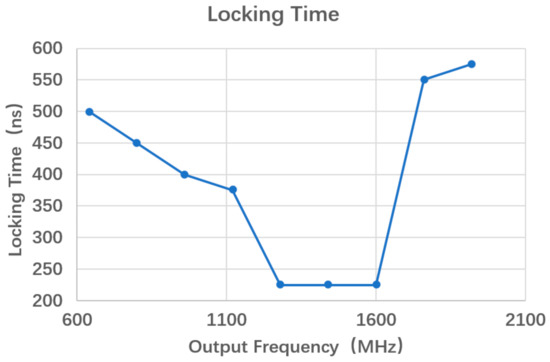 The proposed NS-ADPLL was implemented in SMIC 180 nm CMOS process with a 1.8 V supply. The microphotograph of the prototype chip is illustrated in Figure 10, The entire die area of the NS-ADPLL is 0.04 . Figure 11 shows the locking time in different output frequency, which shows that the best locking time (225 ns, 9 reference clock cycles) occurs at 1.28 GHz to 1.6 GHz; however, the worst one (575 ns, 23 reference clock cycles) at 1.92 GHz. Figure 12 shows the power consumption in different output frequency. The power consumption increases with the output frequency increases. With a 1.8 V supply at 1.92 GHz, the NS-ADPLL consumes 29.48 mW, of which 80% comes from DCO circuit.