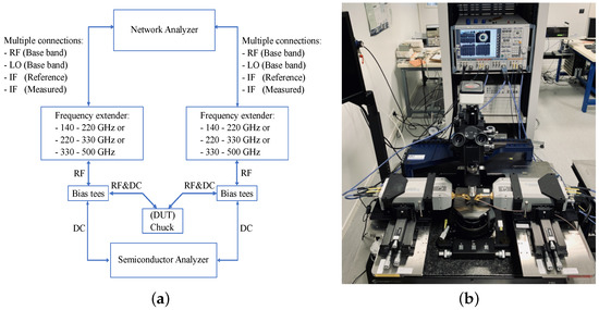 Figure 1. (a) Block diagram of the 140 GHz to 500 GHz measurement set-up, (b) photograph of the probe station for the 140 GHz to 500 GHz measurements, photo taken from [17].