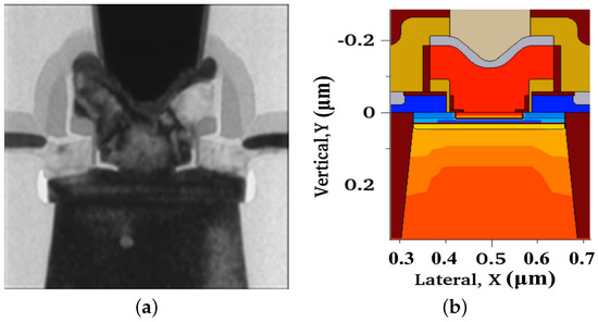 Figure 2. SiGe HBT device structure: (a) TEM image [21] and (b) structure made in sentaurus TCAD.