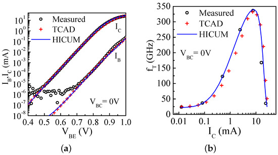 For a detailed TCAD simulation with appropriate calibration, the device doping and layout information extracted in [18] and presented in Table 1 are used. Following the TEM captured device structure and geometry [19] (Figure 2a), a corresponding device structure has been designed in Sentaurus TCAD [20] (Figure 2b). The suitable meshing and corresponding adjustment in TCAD model parameters have already been performed in [20]. Figure 3a,b demonstrate a highly accurate TCAD device calibration with measured data via base-emitter voltage ( V B E ), dependent base ( I B ) and collector currents ( I C ) (i.e., Gummel plot), and I C -dependent f T characteristics, respectively.