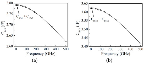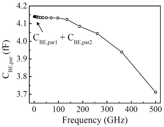 with C 1 = C B E , p a r , 1 and C 2 = C B E , p a r , 2 . Formulation (1) yields C B E , p a r 1 + C B E , p a r 2 when ω 0 and C B E , p a r 1 when ω . The partitioning factor (fbepar) has been extracted directly from the TCAD simulated capacitance versus frequency characteristics (Figure 6) obtained from the customized structure (Figure 5a). The calculated value of the parameter fbepar (=C B E , p a r 2 /(C B E , p a r 1 + C B E , p a r 2 )) is 0.93. Therefore, according to the equivalent circuit of HICUM, most of the C B E , p a r is assigned to the internal transistor with C B E , p a r 2 = 3.2 fF and C B E , p a r 1 = 0.35 fF.