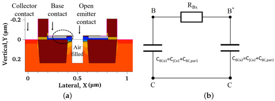 Figure 5. (a) Customized T C A D structure (gray: silicite, blue: p-type poly-Si) and (b) RC equivalent circuit representing the circled region in (a) for the determination of base-emitter parasitic capacitance partitioning factor ( f b e p a r ). Here, B is the external base node.