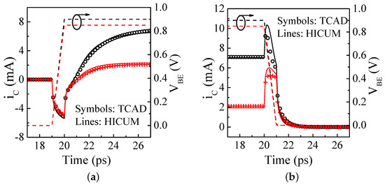 Figure 10. (a) Turn-on and (b) turn-off characteristics for the collector current i C ( t ) : comparison between T C A D (symbols) and HICUM (solid line with a l i t = 1) for a 0.09 μm × 4.8 μm SiGe HBT biased at constant V C E = 0.9 V (circles) and 0.85 V (plus). V B E s ( t ) have been shown as a dashed line to the right Y-axis.