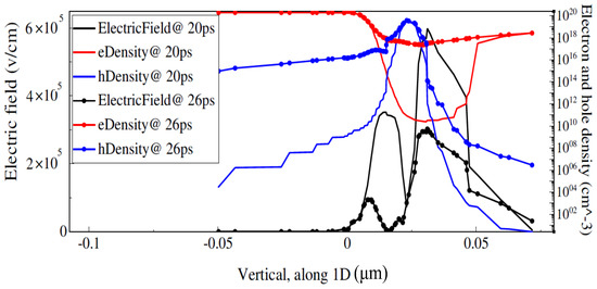Figure 11. Variation of electric field (left axis) and carrier density (right axis) captured at 20 ps (solid line) and 26 ps (solid line with symbols). The bias voltages V B E = V C E are ramped up from 0 V to 0.9 V at 18 ps with a rise time of 2 ps. The value ‘0’ on the x-axis refers to the position where the poly-emitter and mono-emitter meet.