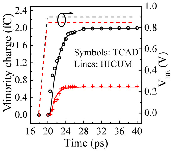 Figure 12. Time dependent turn-on stored minority charge (in the emitter and base): comparison between T C A D (symbols) and HICUM (solid line with a l q f = 1) for the 0.09 μm × 4.8 μm SiGe HBT biased at V B E = 0.9 V (circle) and V B E = 0.85 V (plus), V B C = 0 V. V B E s ( t ) have been shown as a dashed line to the right Y-axis.