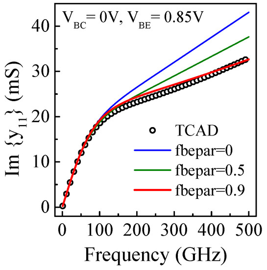 Figure 13. Sensitivity of f b e p a r on frequency dependent y 11 for the 0.09 μm × 4.8 μm SiGe HBT biased at V B C = 0 V with V B E = 0.85 V: comparison between T C A D (circles) and Hicum L2v2.4 (solid line).