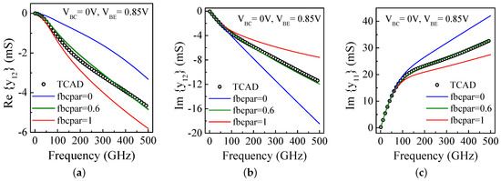 Figure 14. Sensitivity of f b c p a r on frequency dependent y 12 (a), y 12 (b) and y 11 (c) for the 0.09 μm × 4.8 μm SiGe HBT biased at V B C = 0 V with V B E = 0.85 V: comparison between T C A D (circles) and Hicum L2v2.4 (solid line).