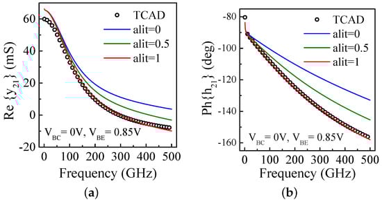 Figure 15. Sensitivity of a l i t on frequency dependent y 21 (a) and P h a s e h 21 (b) for the 0.09 μm × 4.8 μm SiGe HBT biased at V B C = 0 V with V B E = 0.85 V: comparison between T C A D (circles) and Hicum L2v2.4 (solid line).