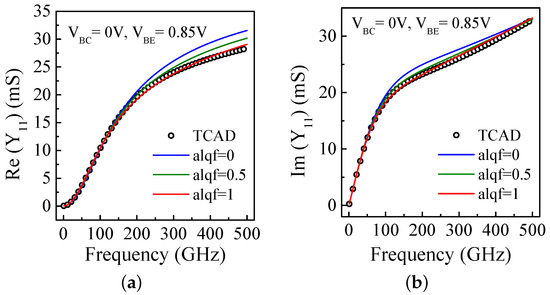 Figure 16. Sensitivity of a l q f on frequency dependent y 11 (a) and y 11 (b) for the 0.09 μm × 4.8 μm SiGe HBT biased at V B C = 0 V with V B E = 0.85 V: comparison between T C A D (circles) and Hicum L2v2.4 (solid line).