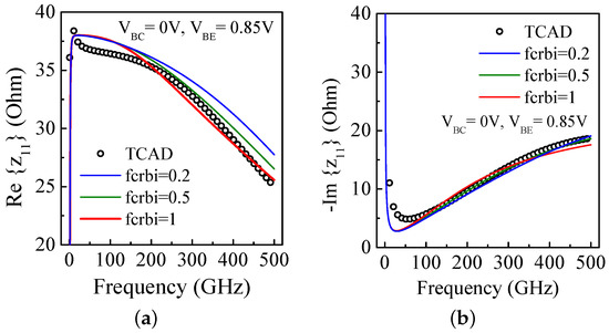 Figure 17. Sensitivity of f c r b i on frequency dependent z 11 (a) and z 11 (b) for the 0.09 μm × 4.8 μm SiGe HBT biased at V B C = 0 V with V B E = 0.85 V: comparison between T C A D (circles) and Hicum L2v2.4 (solid line).